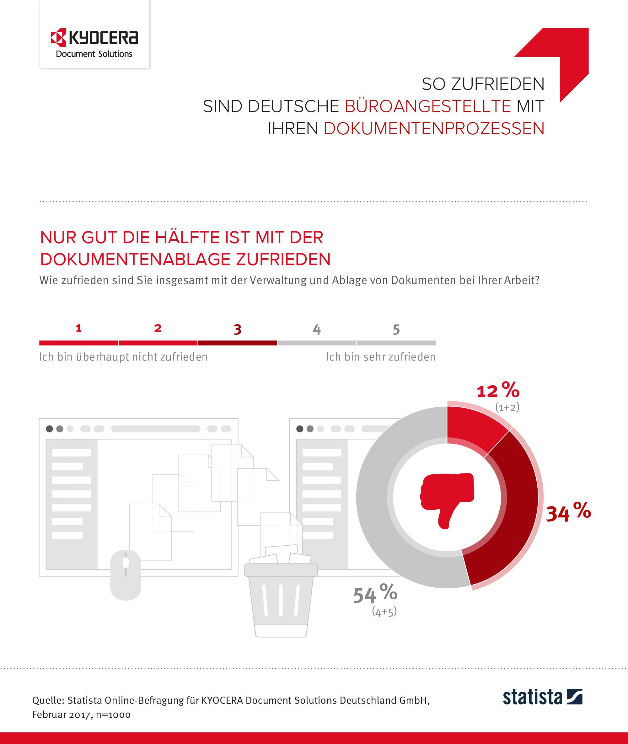 Rechnungen, Aufträge, Konzepte, Korrespondenz: Der Umgang mit Dokumenten hat einen unmittelbaren Einfluss auf die Effizienz von Unternehmensprozessen. Doch gerade beim Management von Informationen besteht in vielen Unternehmen noch Handlungsbedarf, wie eine im Auftrag von KYOCERA Document Solutions durchgeführte Befragung ergeben hat: 1.000 Büromitarbeiter, die für ihre Arbeit einen Computer nutzen, wurden vom Statistikportal statista zu ihrer Zufriedenheit mit ihren Informationsprozessen befragt. Das Ergebnis: Rund die Hälfte der Befragten sieht Verbesserungspotenzial beim Dokumentenmanagement.