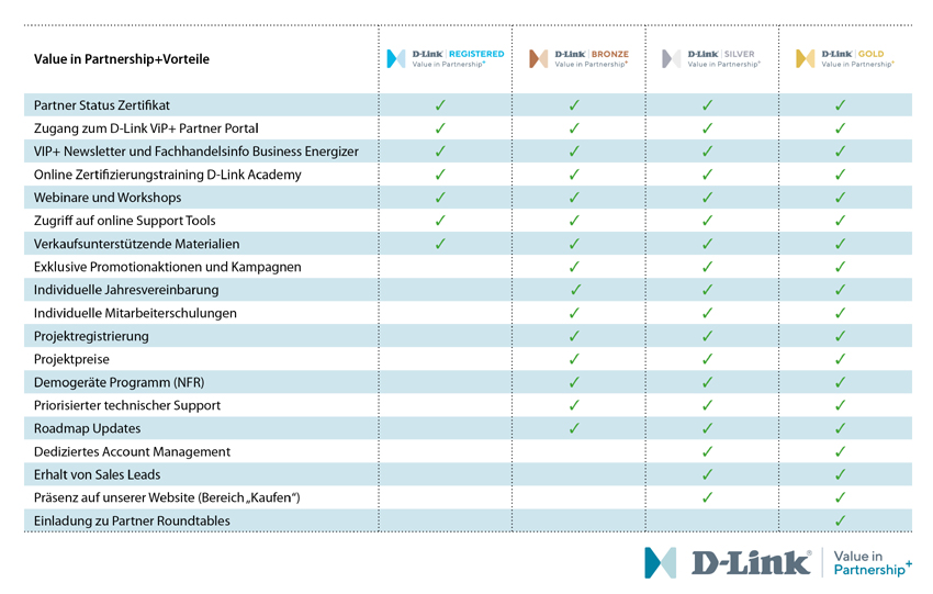 Das D-Link Partnerprogramm ViP+ unterstützt Reseller und Systemhäuser dabei, ihr Geschäft mit D-Link Produkten und Lösungen auszubauen. Beteiligte Partner ab der Partnerstufe „Registered“ können sich über die verschiedenen Stufen hinweg bis zum Gold Partner weiterentwickeln. Die Grundlage bilden Jahresumsatzvereinbarungen, abgeschlossene Trainings sowie Zertifizierungen in den D-Link Kernproduktkategorien. Insgesamt verfügt das D-Link Partnerprogramm über die folgenden vier aufeinander aufbauenden Partnerstufen: