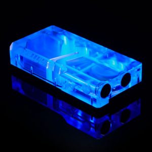 Die quaderförmigen Ausgleichsbehälter aus transparentem Acrylglas besitzen ein einzigartiges Strömungskonzept mit besonders hoher Durchflussrate, welches die Kühlflüssigkeit großflächig über eine vernickelte Kupferplatte leitet. Diese gibt die Abwärme an einen Kühler aus sandgestrahltem Aluminium weiter, der auf der Rückseite mit zahlreichen Finnen versehen ist. Für eine aktive Kühlung lassen sich die Reservoirs über das mitgelieferte Lüfter-Bracket auf Lüftern oder Radiatoren montieren. Aber auch ohne das Bracket stehen viele seitliche Bohrungen für unterschiedliche Montage-Orientierungen zur Verfügung.
